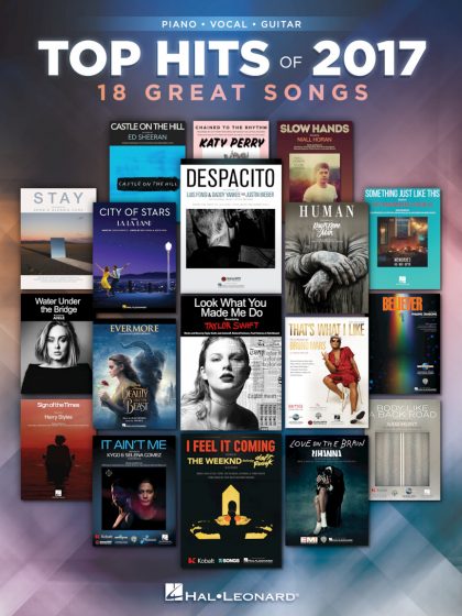 2017's best songs come together in this collection of hits, including: Believer • Body like a Back Road • Castle on the Hill • Chained to the Rhythm • City of Stars • Despacito • Evermore • Human • I Feel It Coming • It Ain't Me • Look What You Made Me Do • Love on the Brain • Sign of the Times • Slow Hands • Something Just like This • Stay • That's What I Like • Water Under the Bridge. Songs are arranged for piano and voice with guitar chord frames.
