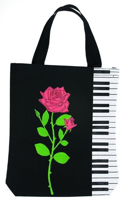 One of the most popular tote bags with students and teachers alike, it features a blooming red rose beside a piano keyboard. 13″x15″ size.