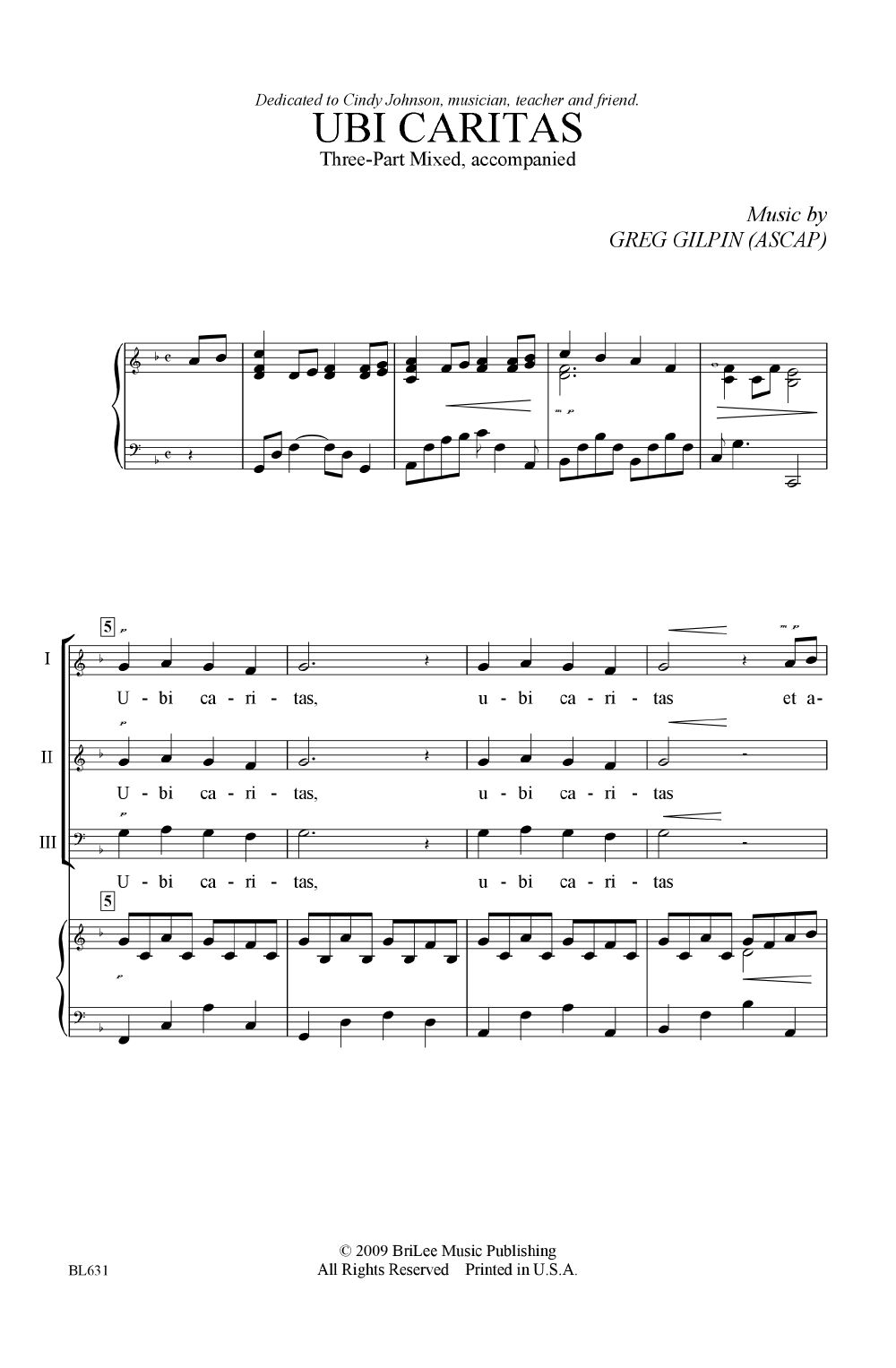 Greg Gilpin delivers a truly elegant setting of the “Ubi Caritas” text, employing a few independent melody lines for variety without being too exposed.