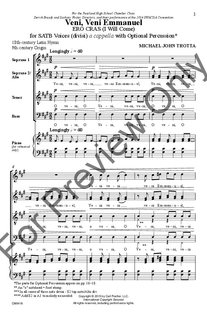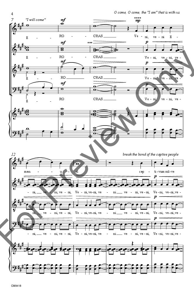 Trotta conceived this well-known Latin text as a dialogue between supplicants and the Creator, a combination of old and new. He masterfully juxtaposes a personal longing for something still to come with the steadfast assurance of something ever-present, yet not always seen. While the original theme is associated with the Christmas season, the wider theme of longing for something greater is universal to the human condition and allows this piece to be programmed throughout the year. A fitting piece for any concert, contest or festival.
