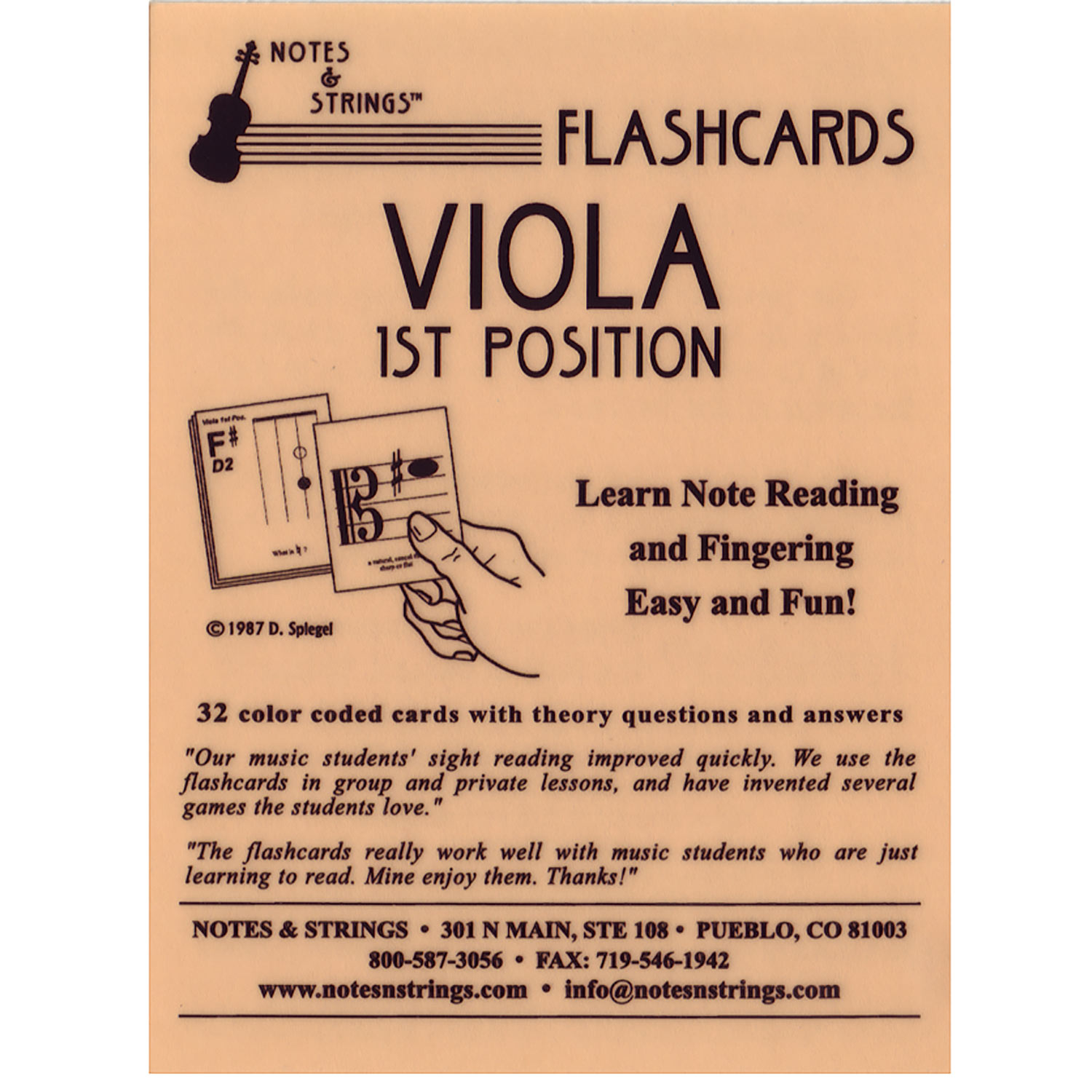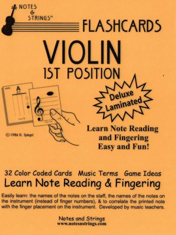 Notes & Strings string instrument music flashcards have the note on one side and the note name and fingering illustrated on reverse.