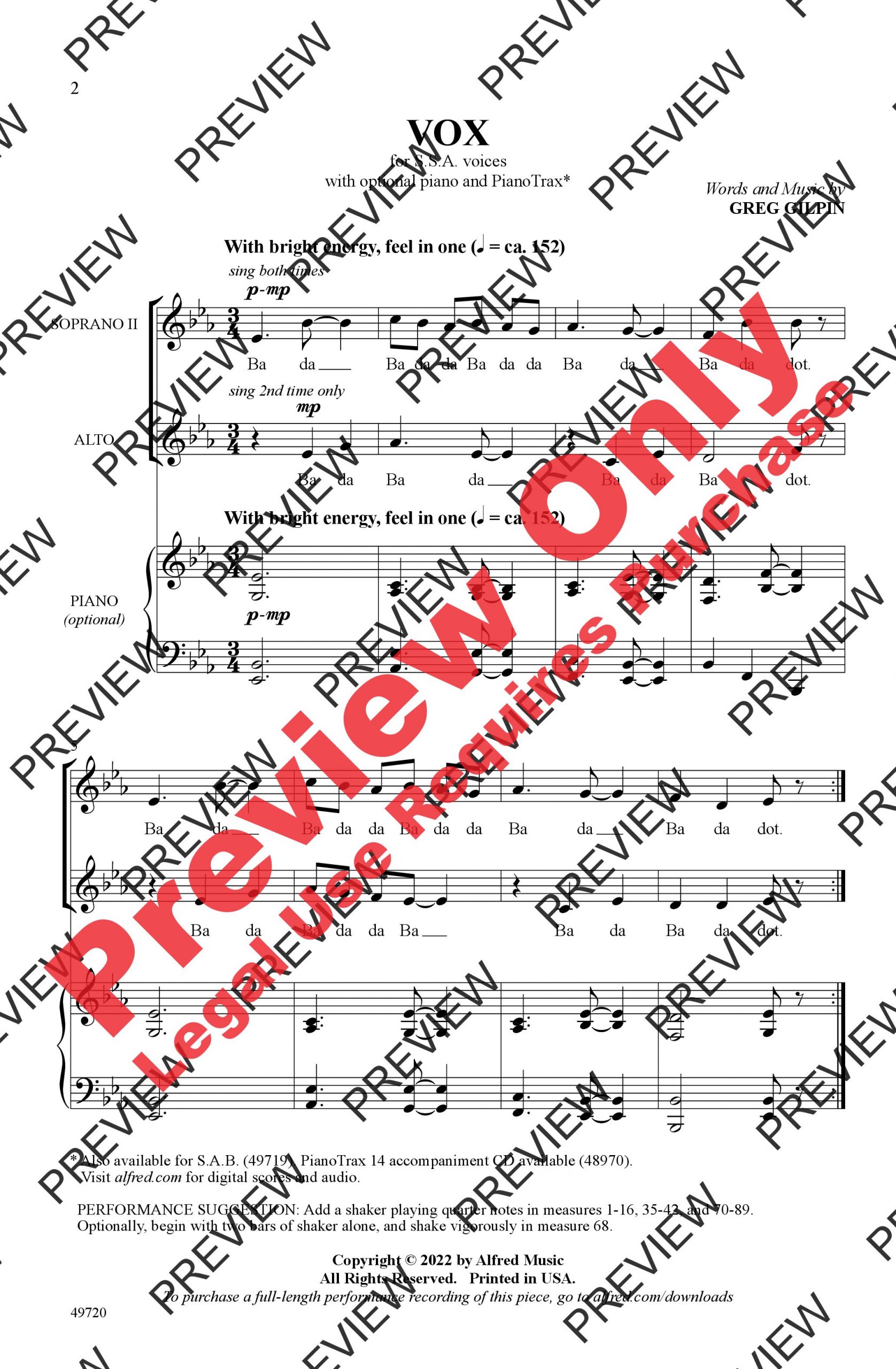 Enjoy the bright energy of ¾ felt in one. This rhythmic Greg Gilpin original may be accompanied by shaker alone or the optional keyboard part. Vibrant vocables have no literal meaning, but virtually bubble with joy—there's a smile built in. A complete form with contrasting sections, varied choral articulations, ostinatos, pedal tones, drones, the works. It's an action-packed musical journey, a colorful collage for the ears.