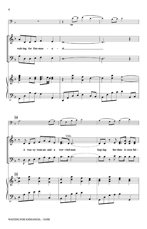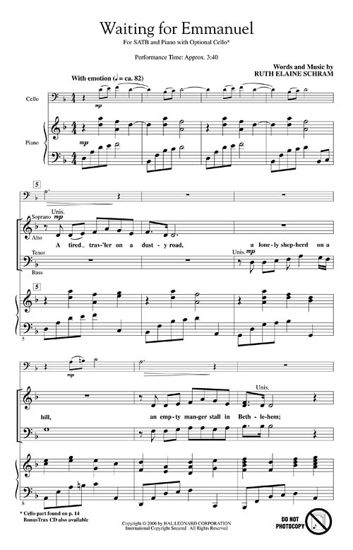 The plaintive melody and text surrounded by cello (included with the choral octavo) and piano, describe all who wait for the arrival of Emmanuel.