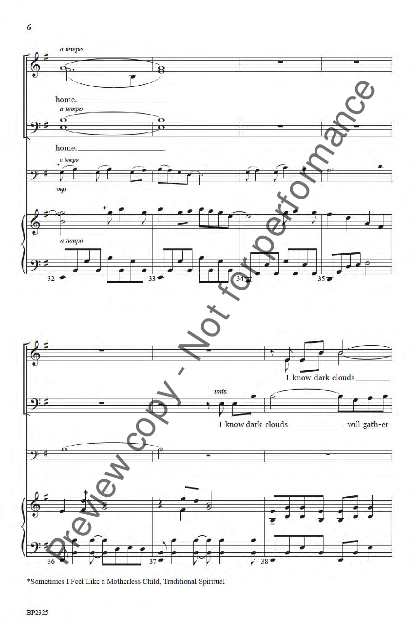 A haunting and soulful treatment of the well-known spiritual. The choral writing is refined yet simple, and instrumental echoes of “Sometimes I Feel Like a Motherless Child” add further depth of expression.