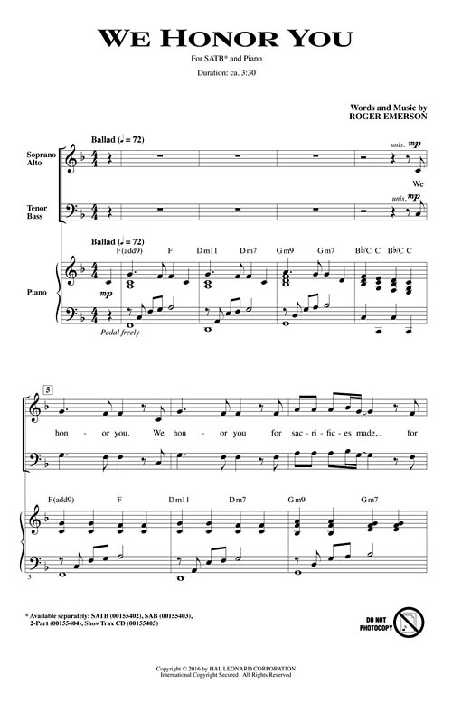For Veteran's Day and other commemorative occasions honoring our troops, this powerful original is a perfect salute to those who serve. Well-crafted vocal parts ensure success for younger and developing choirs and it is well-suited to simple choreography or visual imagery.