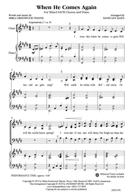 Enjoy this beautiful and uplifting arrangement of the beloved primary children's song 'When He Comes Again' by David Len Allen. Perfect for mixed SATB chorus and piano, this piece is sure to inspire and bring joy to all who listen.