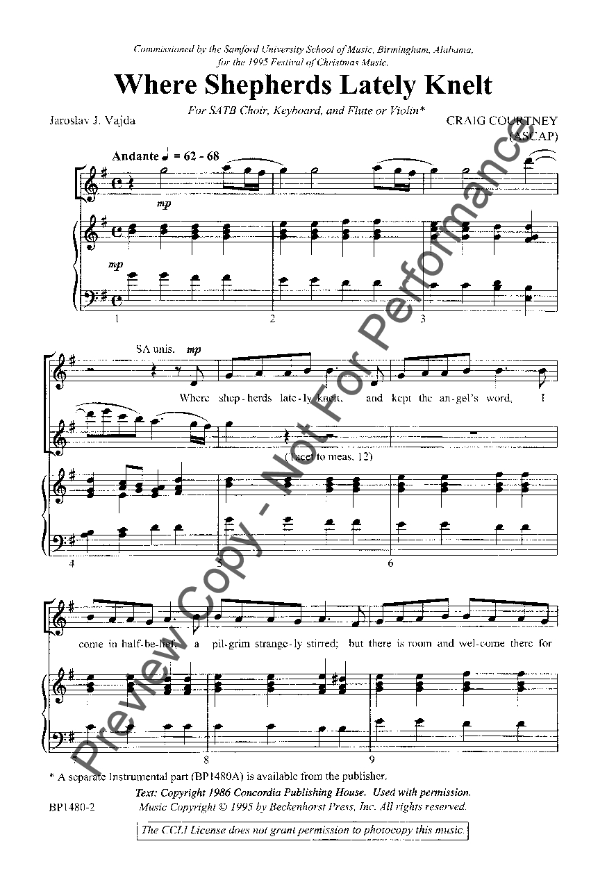 Where Shepherds Lately Knelt is a beautiful holiday choice that will delight all audiences. With Music by Craig Courtney, the optional flute or violin will complete your Christmas program.