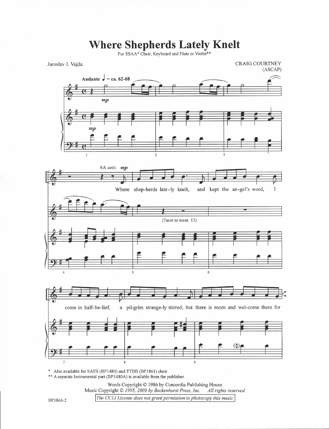 Where Shepherds Lately Knelt is a beautiful holiday choice that will delight all audiences. With Music by Craig Courtney, the optional flute or violin will complete your Christmas program.
