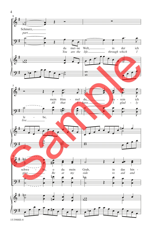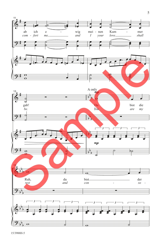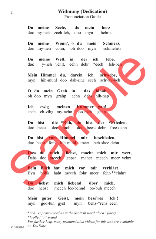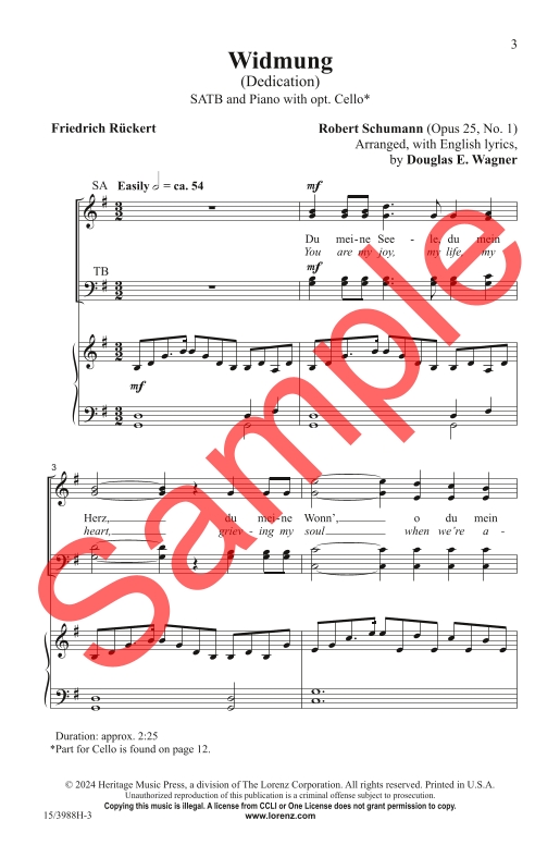 Romantic era composer Robert Schumann's love song, Widmung (Dedication) has been arranged for SATB choirs with the original German text by Friedrich Ru¨ckert. Arranger, Douglas E. Wagner has written English lyrics as a performance option. This sentimental work is beautifully set for choirs with an expressive optional cello accompaniment. Mature choirs will love the musicality and elegant nature of this work.