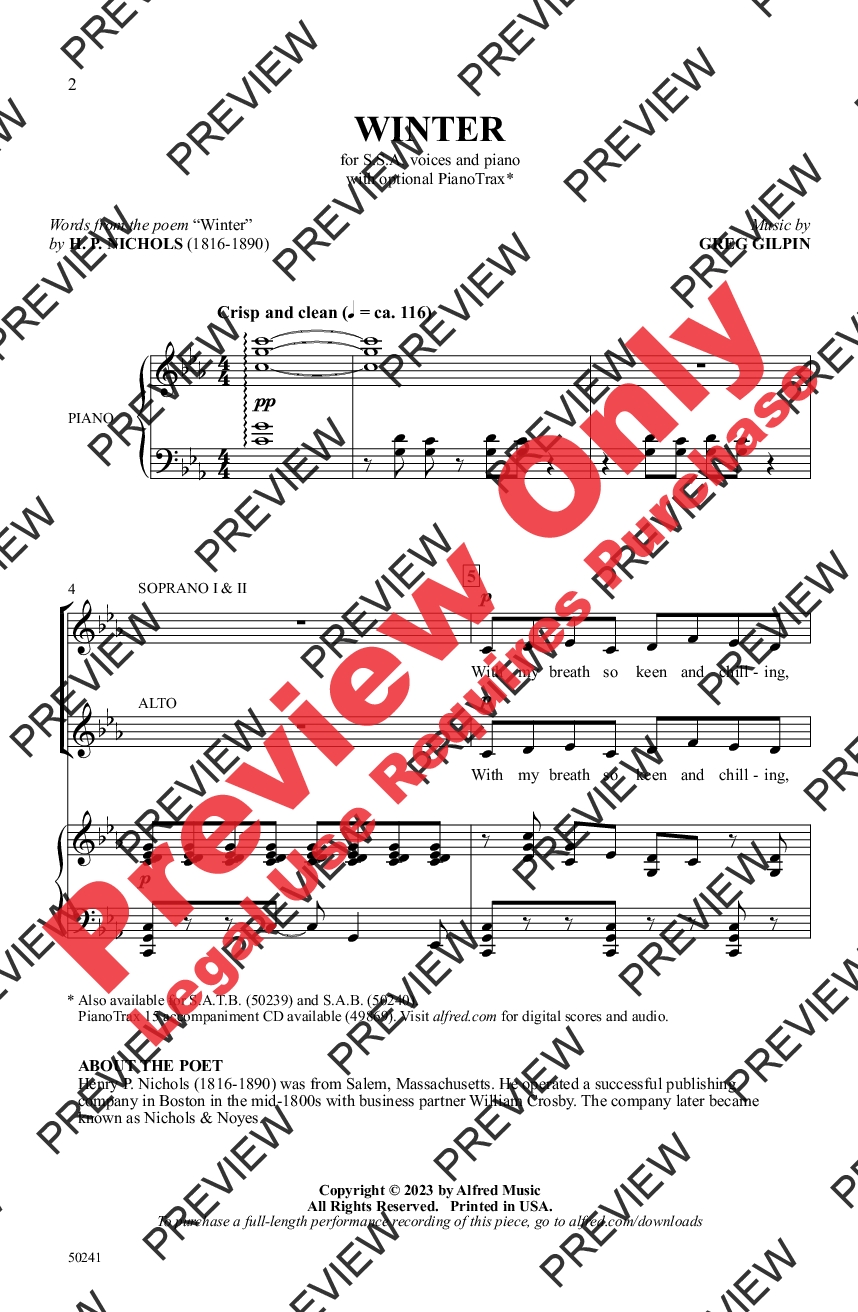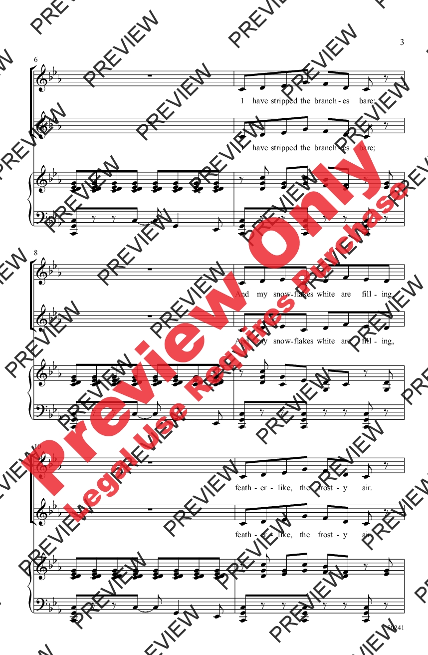 Quiet, crisp lines are echoed from voice to voice and punctuated with chilling whispers in this rhythmic setting told from winter's point of view. A mixed meter refrain creates a sense of surprise when ice “locks the fountains and chains the river,” and a layered counterpoint section builds to a frosty celebration of the season.